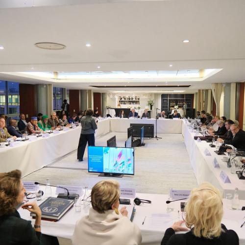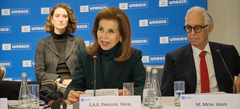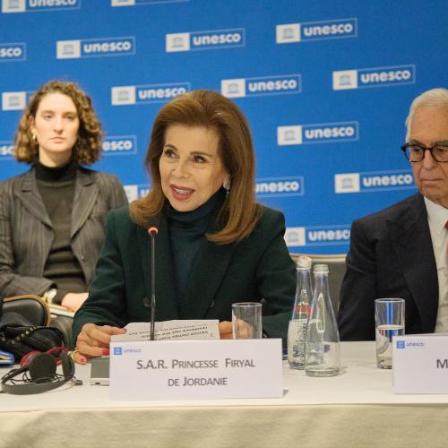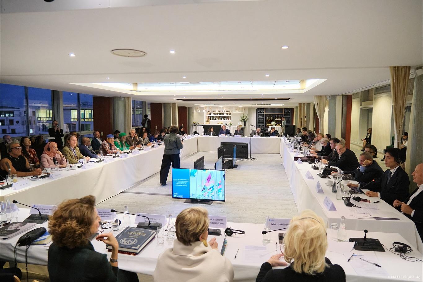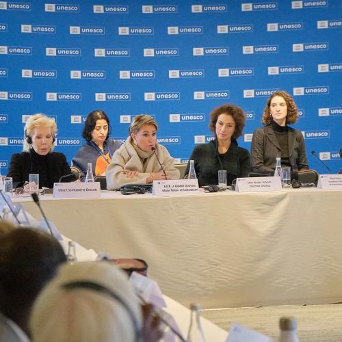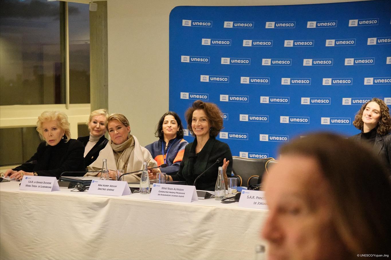 Aux côtés de la princesse Firyal de Jordanie, de Marc Ladreit de Lacharrière, de Ute-Henriette Ohoven et de Guila Clara Kessous, Artiste de l’UNESCO pour la paix, la Grande-Duchesse a participé aux échanges sur les priorités actuelles de l’organisation : éducation, culture, coopération internationale et promotion de la paix.