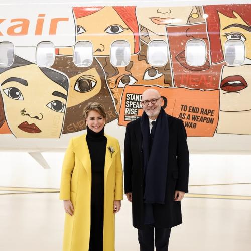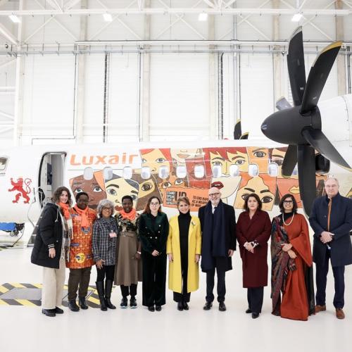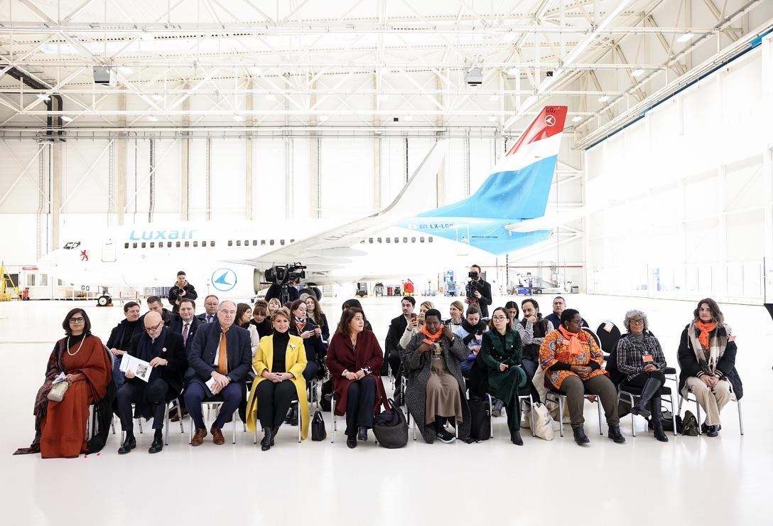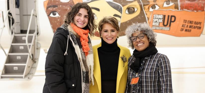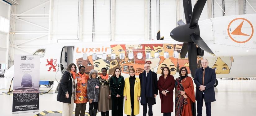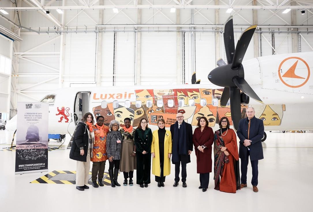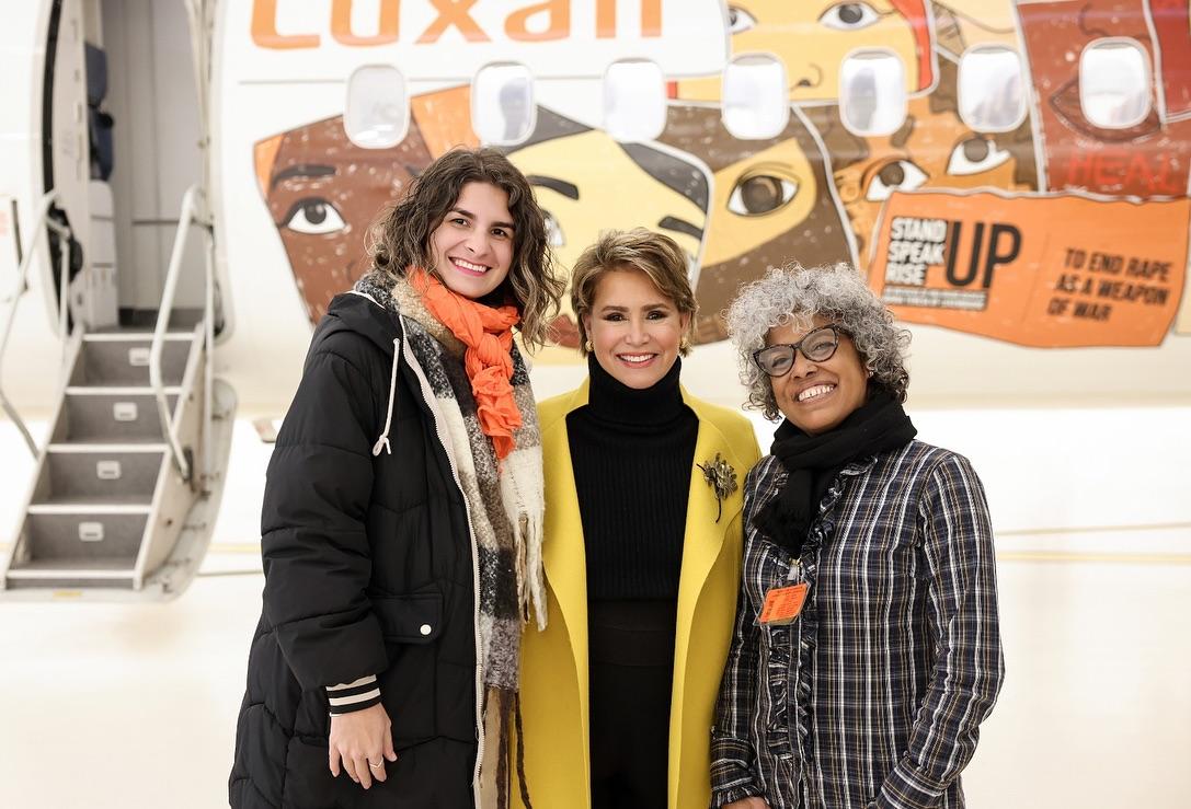 Un avion Luxair arborera fièrement les couleurs de Stand Speak Rise Up! et les visages des femmes victimes de violences dans le monde, survolant le continent pour éveiller les consciences et incarner l’espoir. Ce symbole est un rappel puissant que la lutte pour mettre fin au viol comme arme de guerre ne connaît aucune frontière.