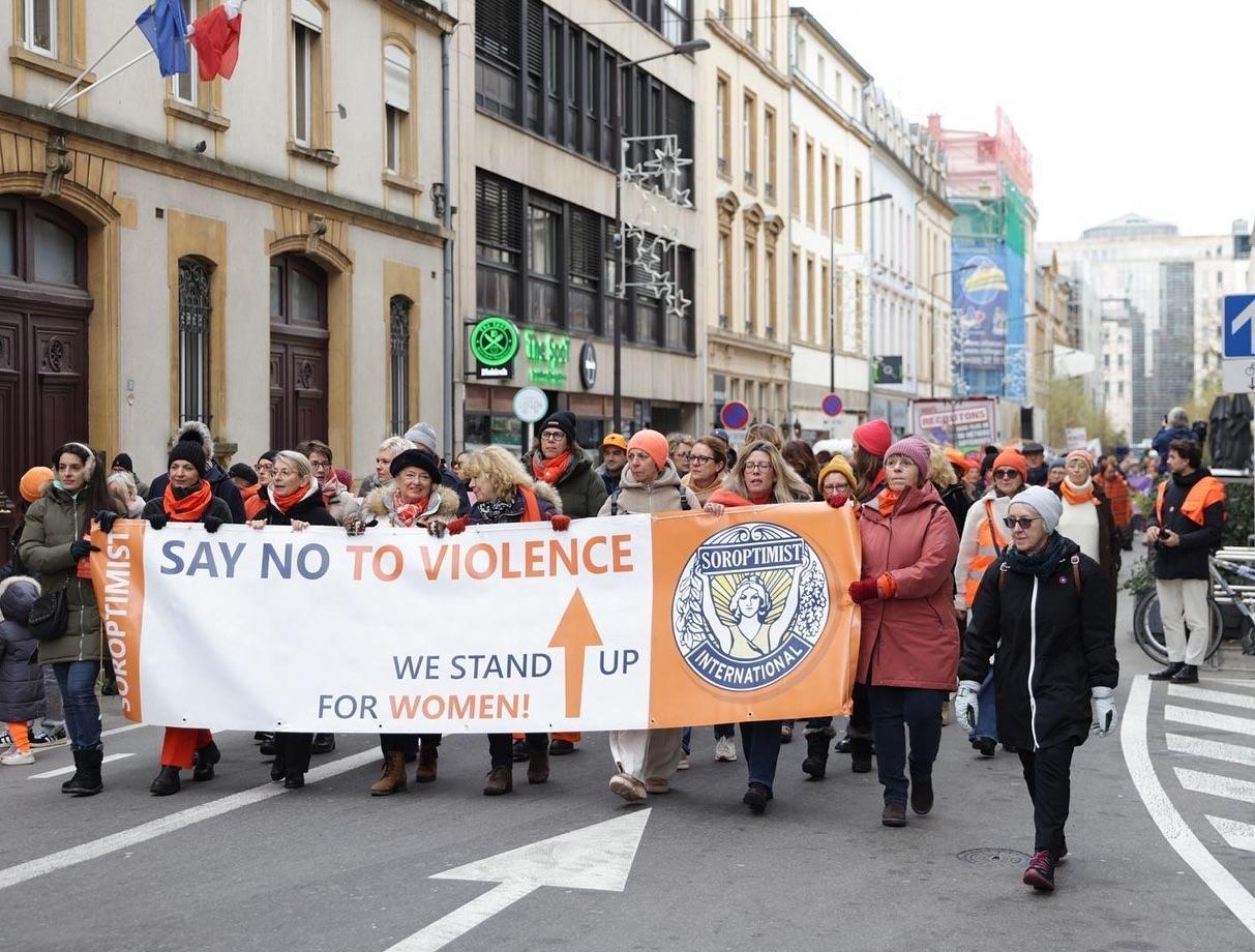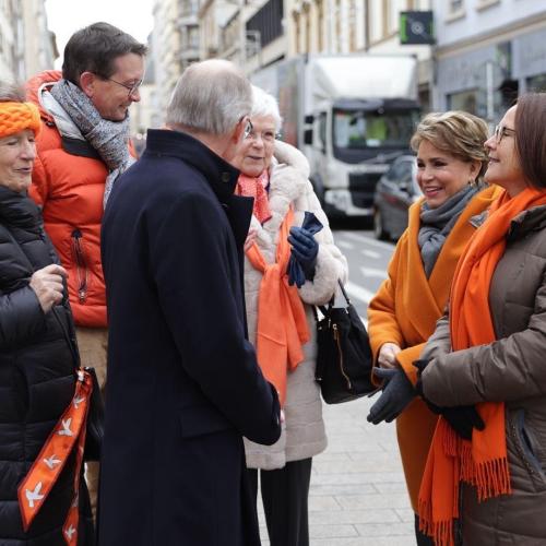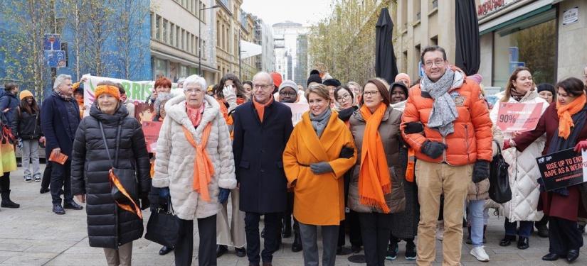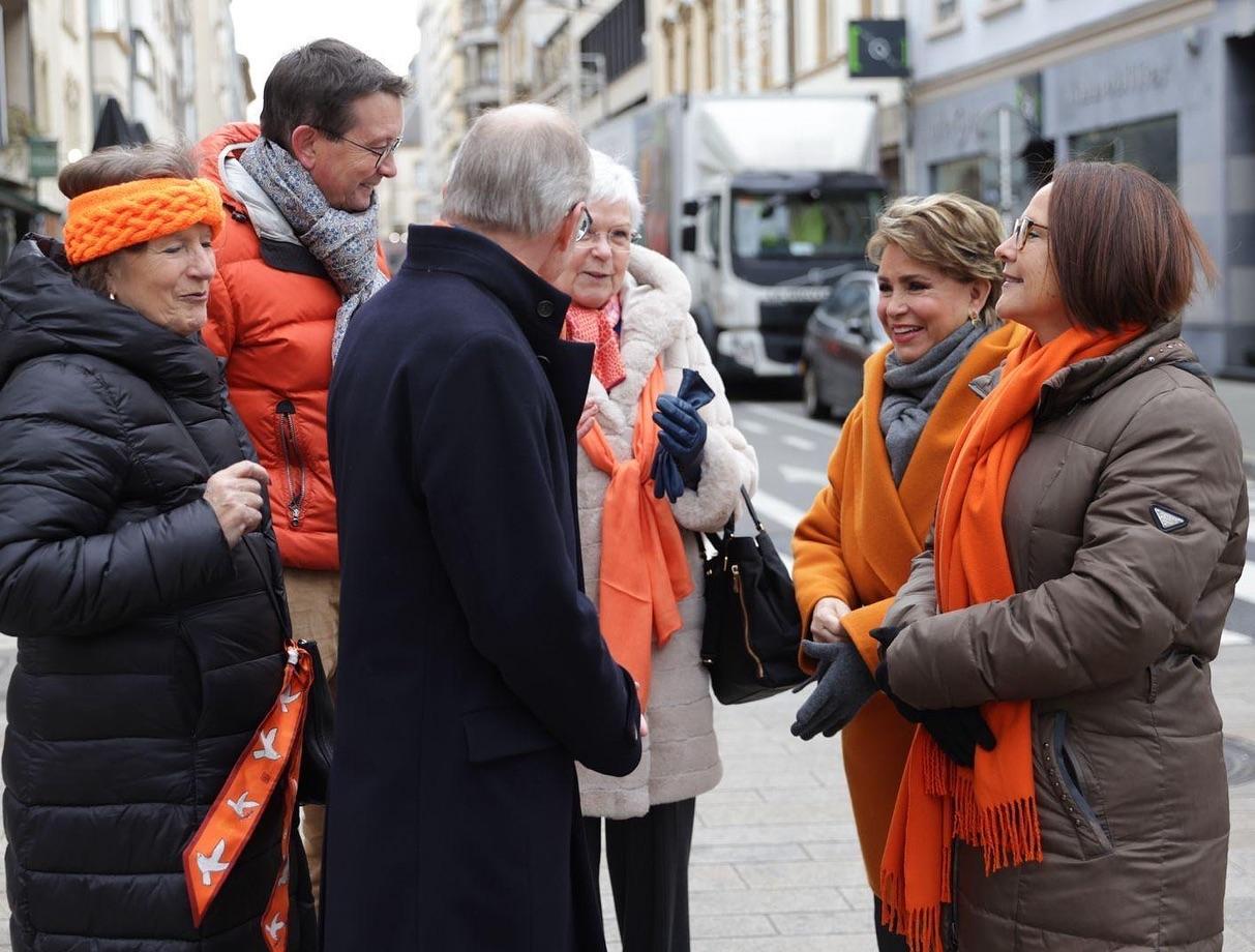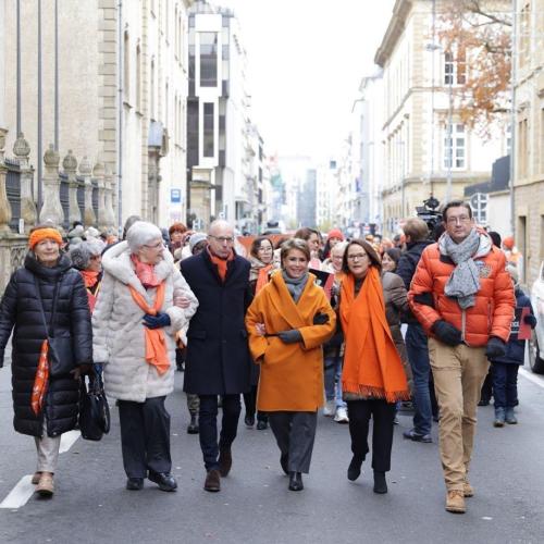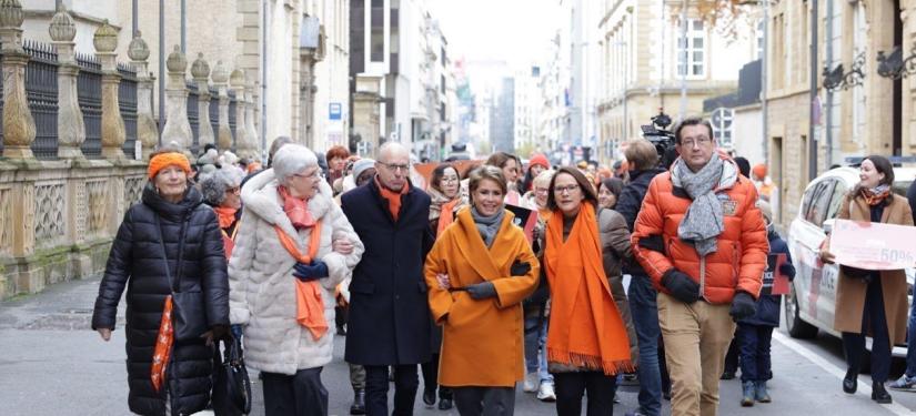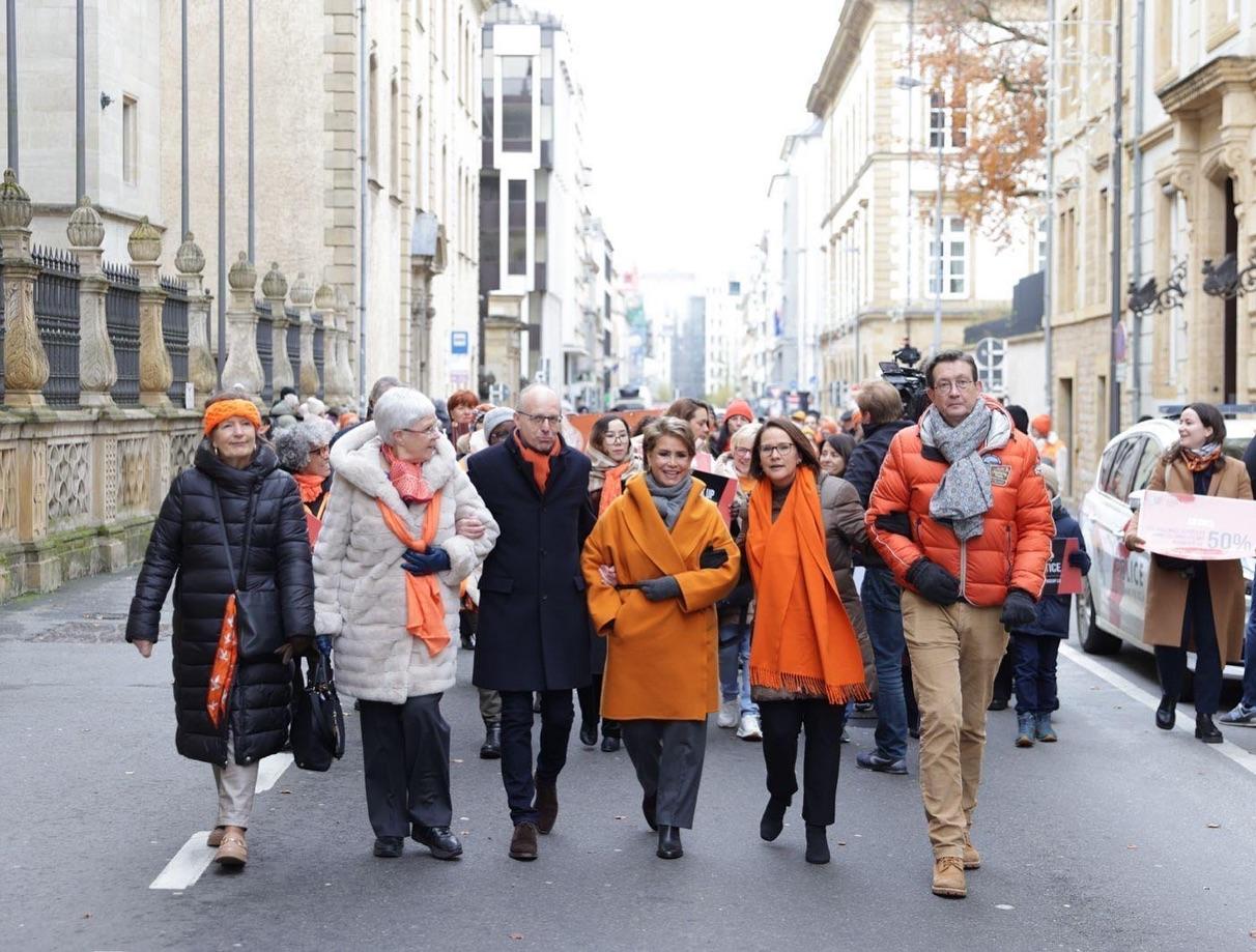 Dans le cadre de l’Orange Week, une grande marche organisée par le CNFL s’est tenue dans le centre de Luxembourg-ville pour dénoncer les violences faites aux femmes. S.A.R. la Grande-Duchesse a pris part à cet événement accompagnée par Luc Frieden, Premier ministre luxembourgeois, Yuriko Backes, ministre de l’égalité des chances, ainsi que Maurice Bauer, échevin de la Ville de Luxembourg, ainsi que Claudine Speltz, présidente du CNFL.