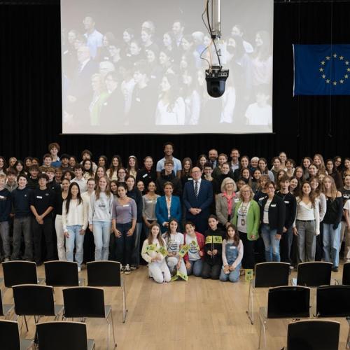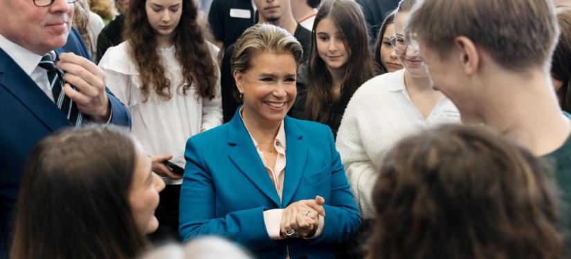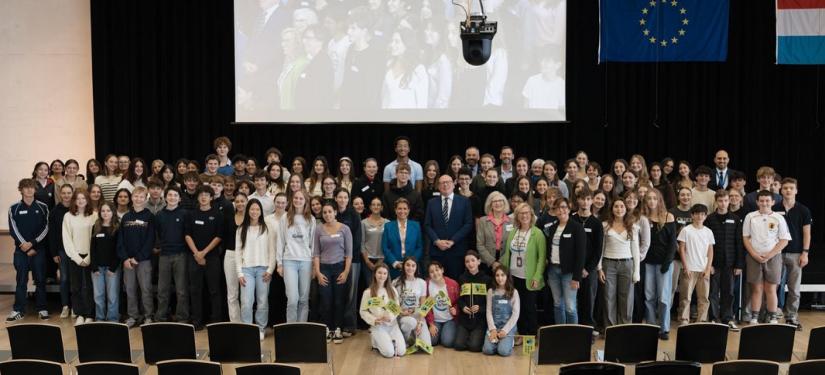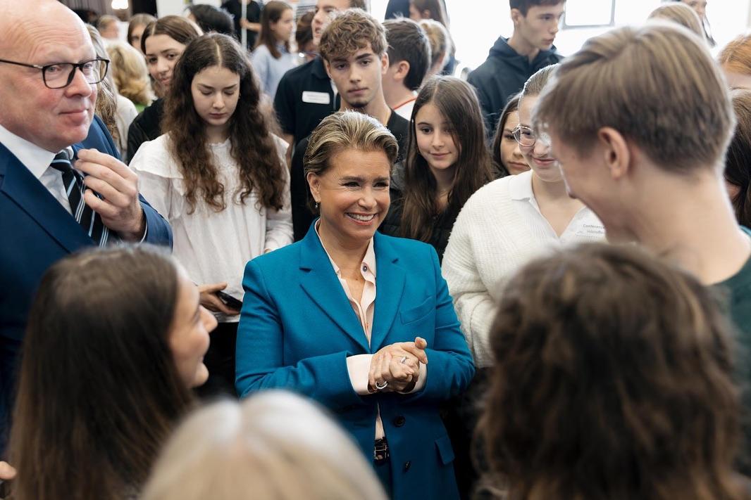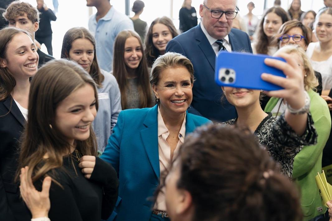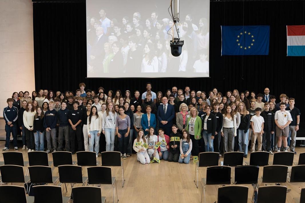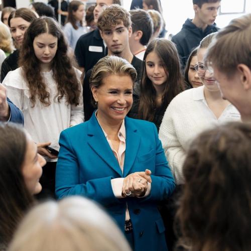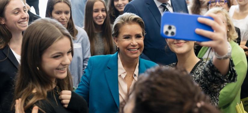 S.A.R. la Grande-Duchesse était en fin de matinée, à l’École européenne II à Mamer pour une rencontre avec les élèves sur le thème de l’engagement social. Elle y a été accueillie par le Directeur Maurice van Daal, la Présidente du Comité des élèves Inès et l’initiatrice du projet Julia.