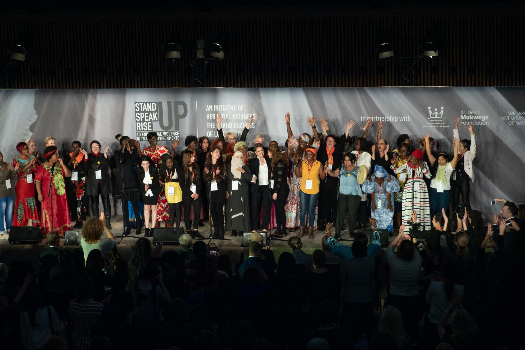 La Grande-Duchesse soutient depuis de nombreuses années les survivantes, et a organisé en mars 2019, le Forum Stand Speak Rise Up! pour elles, afin qu’elles soient au cœur des débats. Le Forum avait alors réuni 50 survivantes du réseau SEMA venues de 17 pays. S’en est suivie la création de l’association Stand Speak Rise Up! en septembre 2019, afin de poursuivre les mêmes objectifs : mettre fin aux viols de guerre et aux violences sexuelles en zones sensibles.⠀
