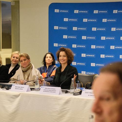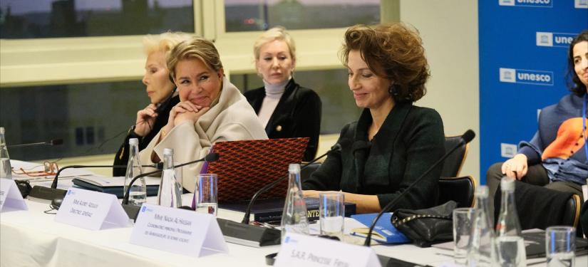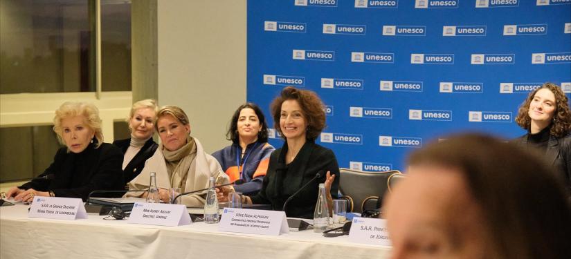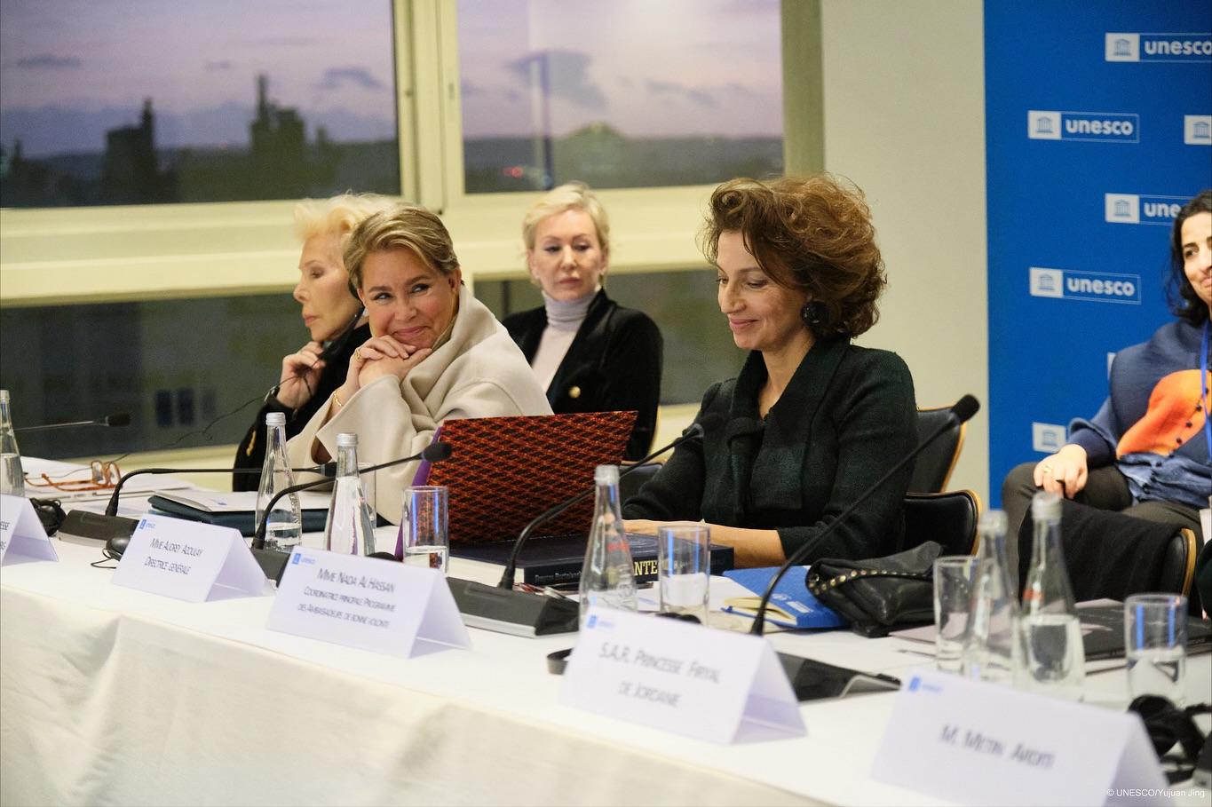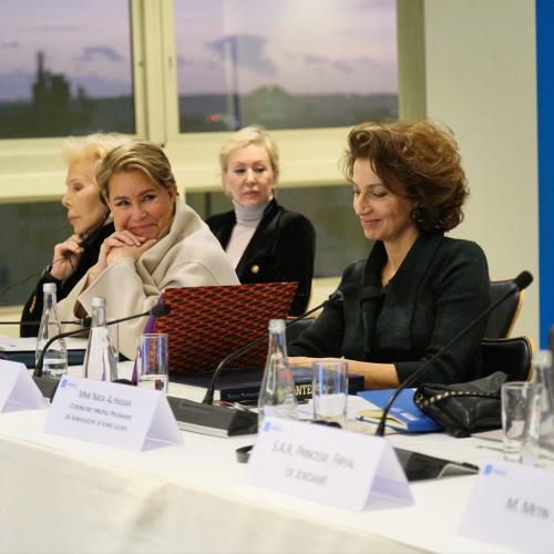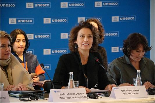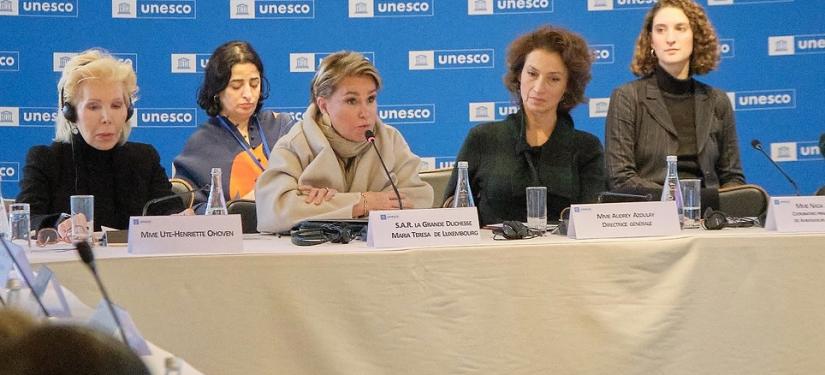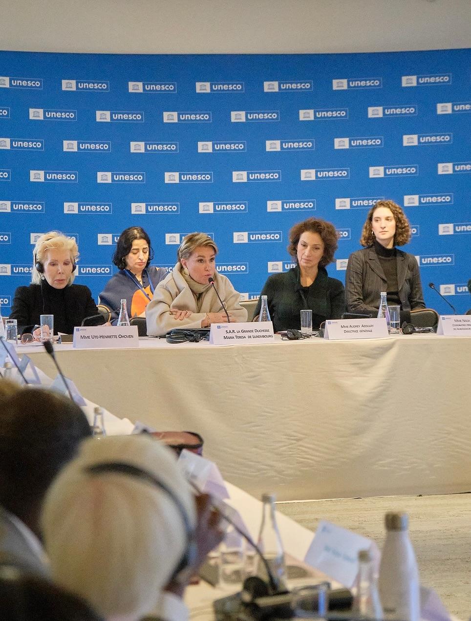 Aux côtés de la princesse Firyal de Jordanie, de Marc Ladreit de Lacharrière, de Ute-Henriette Ohoven et de Guila Clara Kessous, Artiste de l’UNESCO pour la paix, la Grande-Duchesse a participé aux échanges sur les priorités actuelles de l’organisation : éducation, culture, coopération internationale et promotion de la paix.