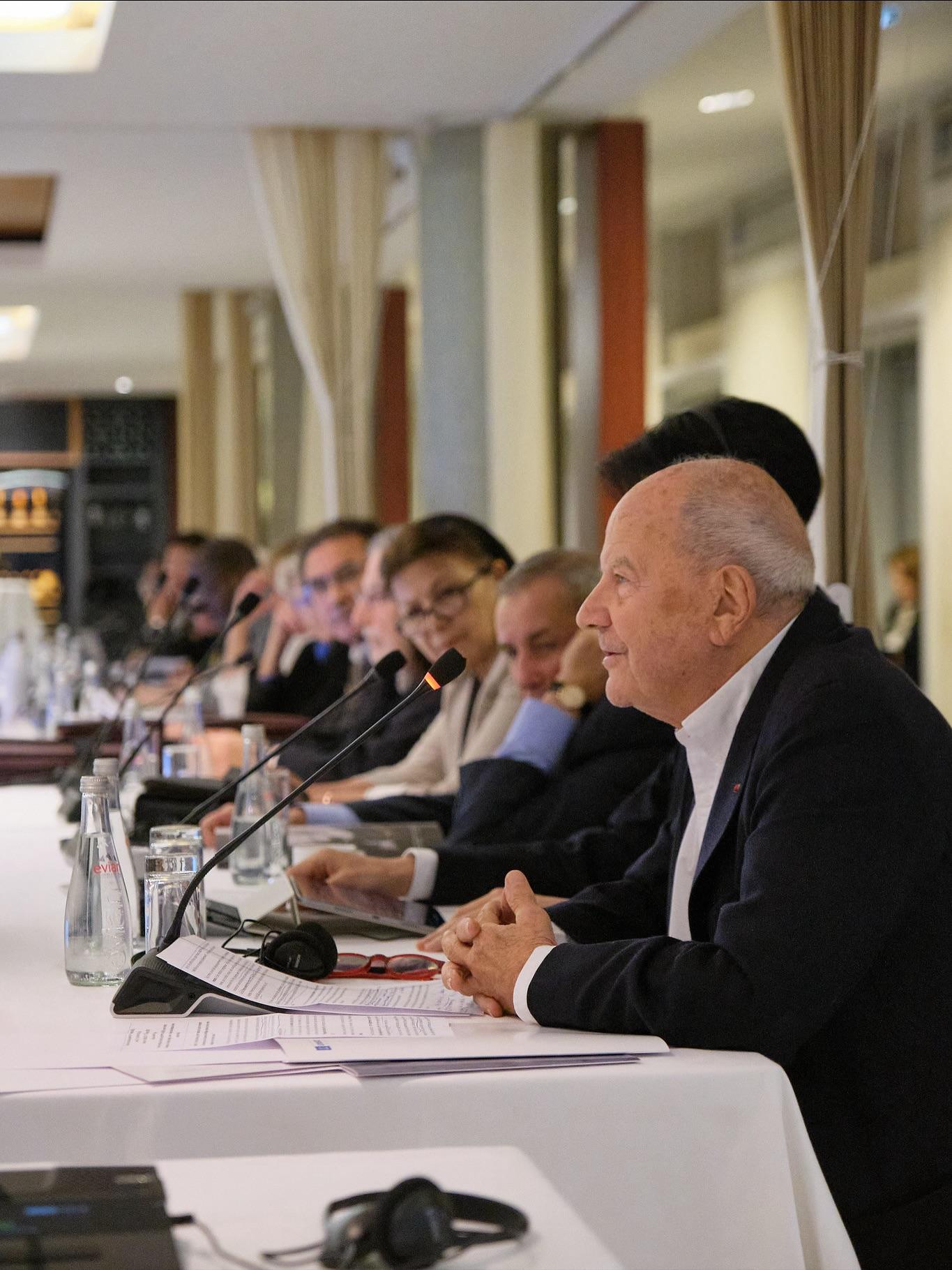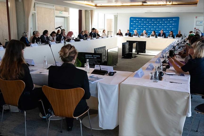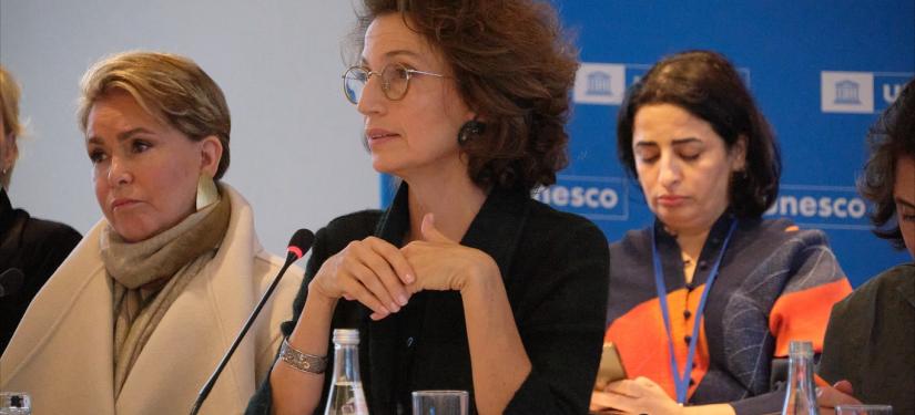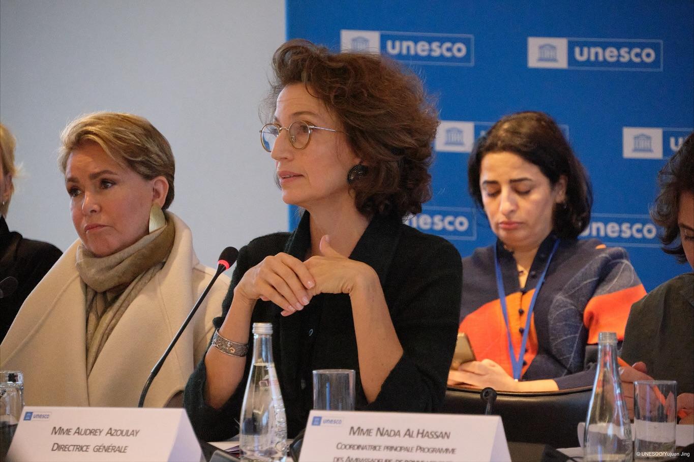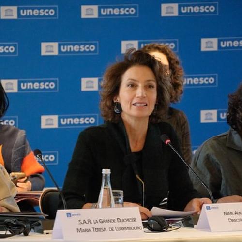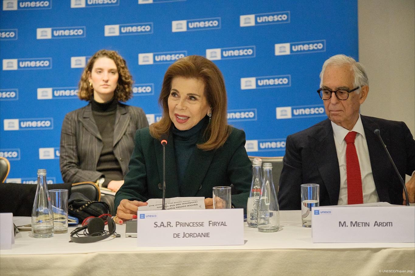 Aux côtés de la princesse Firyal de Jordanie, de Marc Ladreit de Lacharrière, de Ute-Henriette Ohoven et de Guila Clara Kessous, Artiste de l’UNESCO pour la paix, la Grande-Duchesse a participé aux échanges sur les priorités actuelles de l’organisation : éducation, culture, coopération internationale et promotion de la paix.