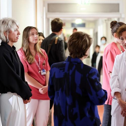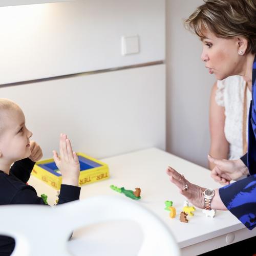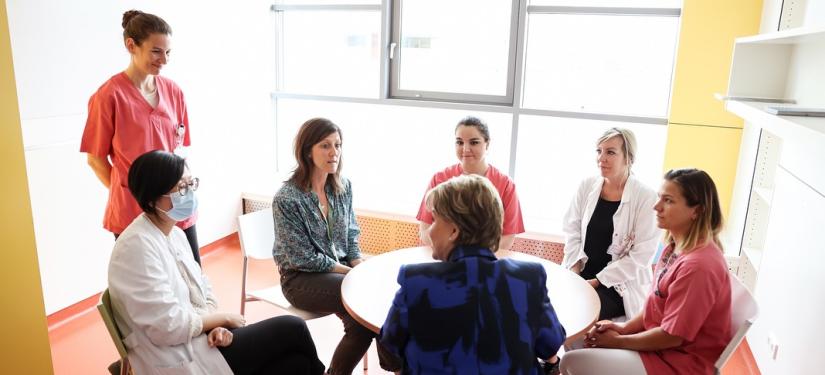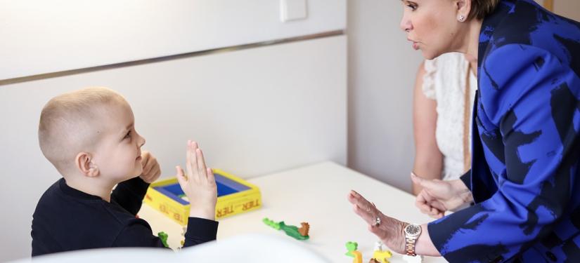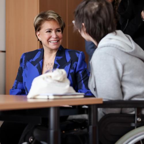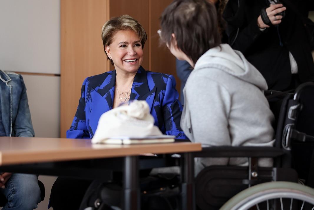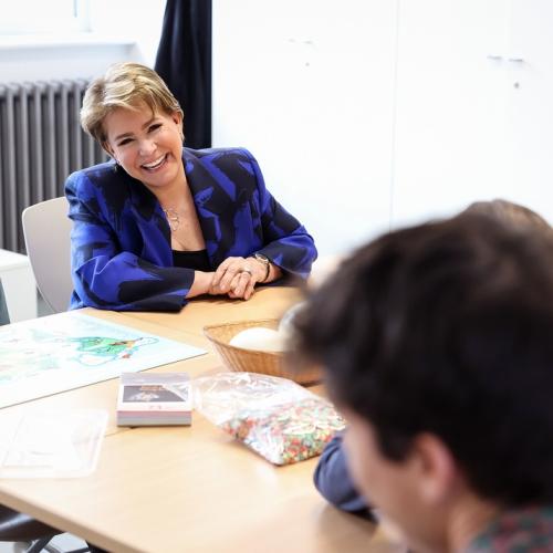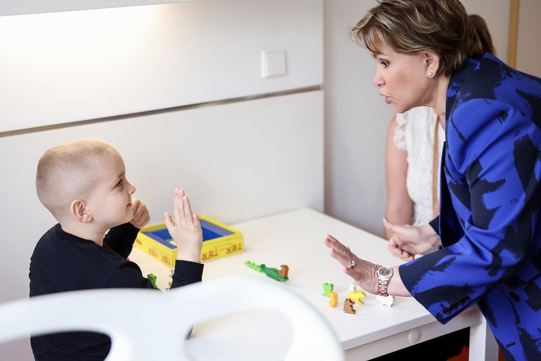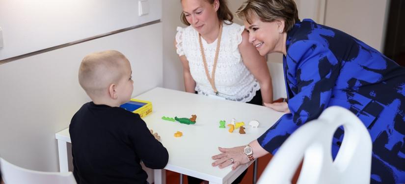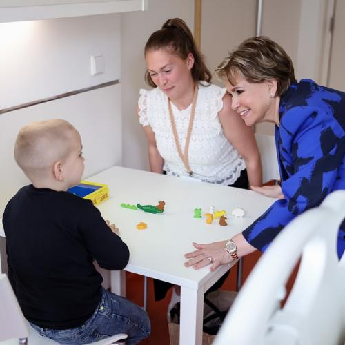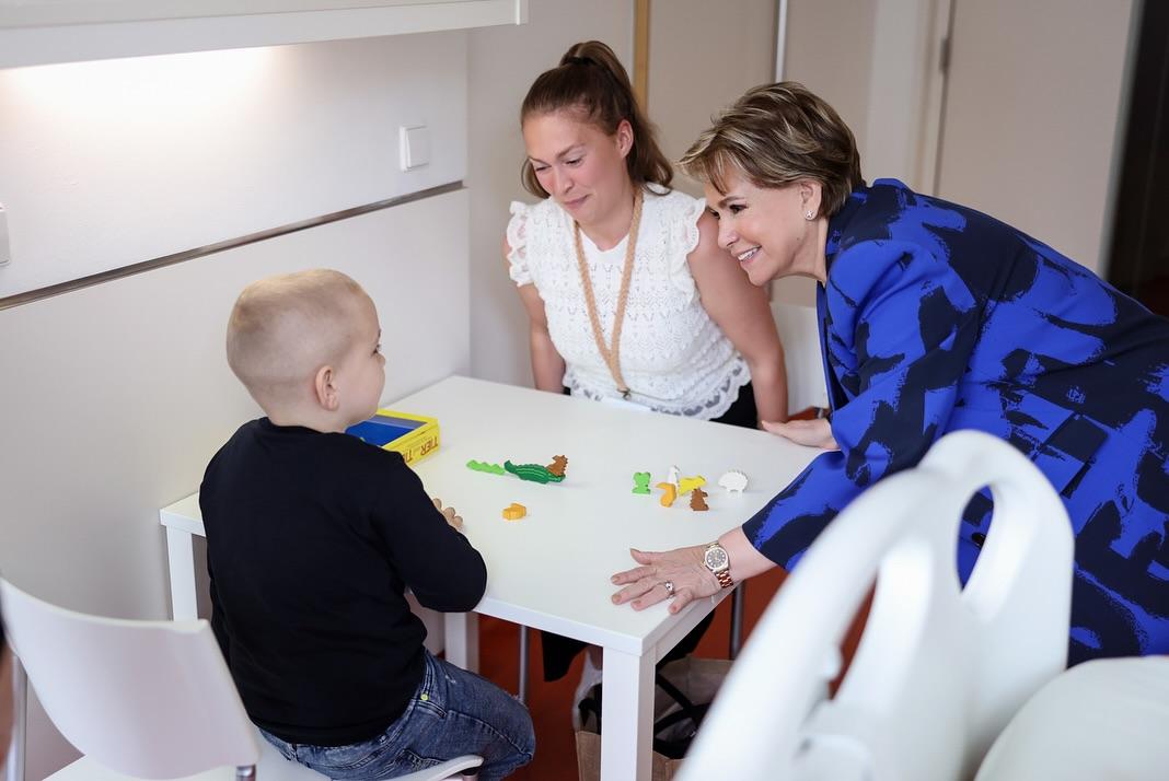 La Grande Duchesse a échangé avec Kasper, Nelli, Noémie et Samed, leurs parents et le personnel du service pédiatrique, médecins et infirmières, psychologues, assistants sociaux. Elle s’est ensuite enquise du programme scolaire que les enfants poursuivent quand leur hospitalisation est de longue durée.