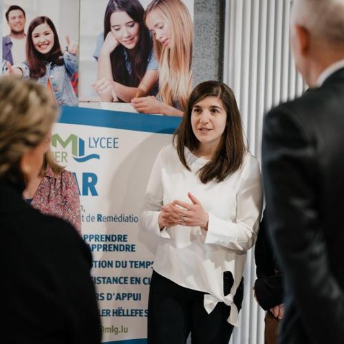 Leurs Altesses Royales ont aussi découvert la fibre entrepreneuriale des élèves à la tête de petites entreprises : « Natierlech Energy », « Lët’z Plant », « House of Resin » et « Liquid Soap ». L’esprit créatif et la maturité des entrepreneurs en herbe ont reçu les honneurs du Couple grand-ducal.