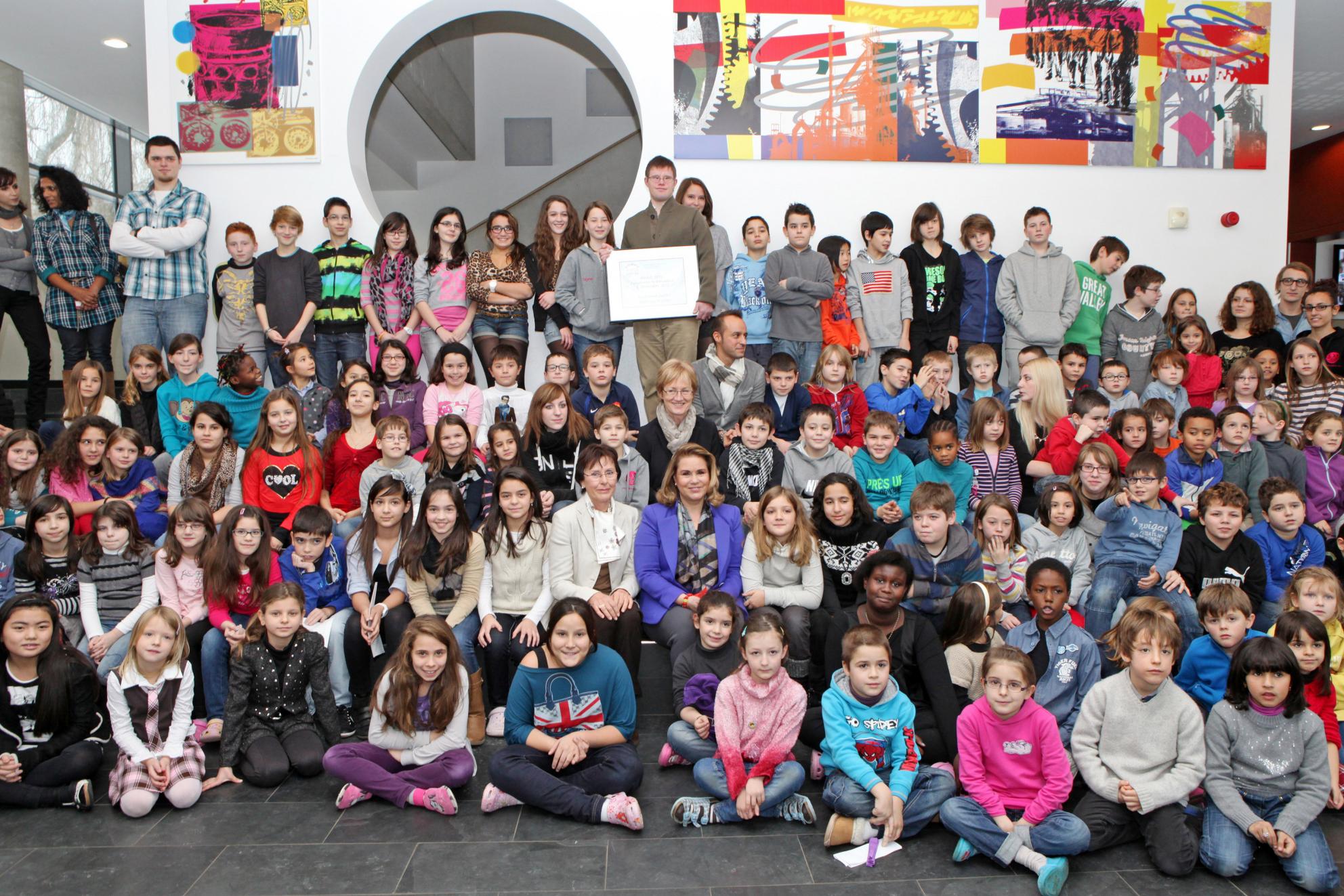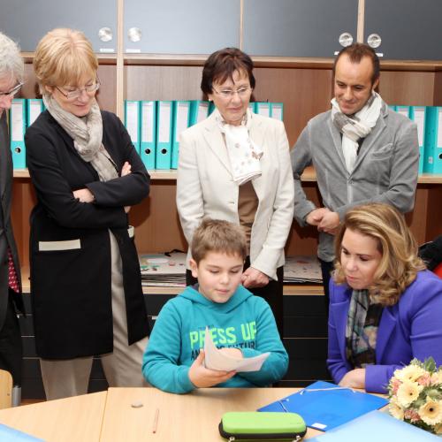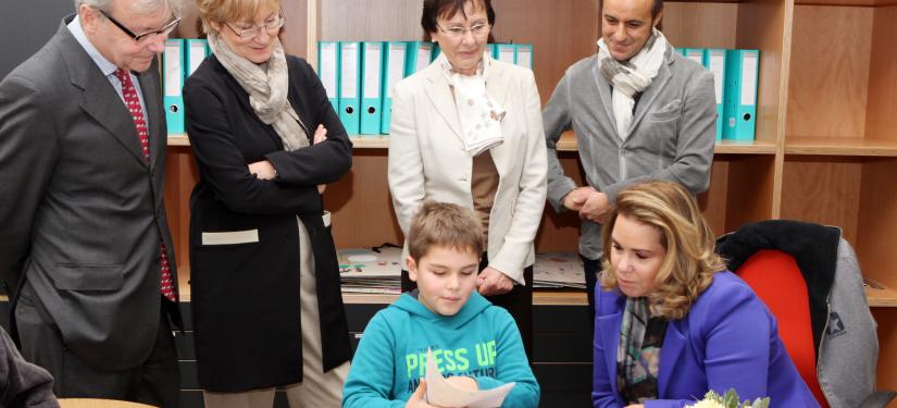 A l’issue de la visite, S.A.R. la Grande-Duchesse et la Présidente de EPI, Jetty Ury, ont descerné le prix "Zesummen fir Integratioun" au Président de l’école fondamentale Jean Jaurès, Enrico Tritta. EPI, fondé en 1990 par des parents d’enfants à besoins spécifiques et l’association "Elteren fir Integration" a fusionné en 1995 avec l’asbl "Pedagoge fir Integratioun" (créée en 1994) pour devenir l’association "Elteren a Pedagoge fir Integratioun" (EPI). EPI a fêté en 2010 son 20ème anniversaire en présence de S.A.R. la Grande-Duchesse (présentation du film "Lynn", co-financé par la Fondation du Grand-Duc et de la Grande-Duchesse). L’objectif prioritaire d’EPI est la promotion de la vie en commun de toutes personnes avec ou sans handicap à tous les niveaux de la société, de la crèche aux loisirs en passant par l’éducation, la formation et la vie professionnelle. La Fondation du Grand-Duc et de la Grande-Duchesse soutient EPI dans le cadre d’une soirée de théâtre inclusive "All ‘e’ in". Depuis 2003, EPI attribue tous les ans, le 3 décembre à l’occasion de la journée internationale des personnes handicapées, le prix "Zesummen fir Integratioun". Par ce prix, l’association soutient des initiatives et des idées novatrices en matière d’intégration scolaire et sociale de personnes à besoins spécifiques.